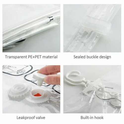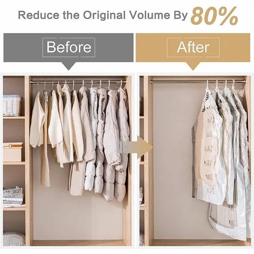 Keep Clothes Flat and Clean:Closet organizer uses a waterproof and dust-proof design, which helps to keep clothes flat and clean. Save 80% Space:Space Saver Bags can efficiently organize your wardrobe and your room. It is very suitable for household storage and can save 80% of space. Easy to Use:Closet organizers and storage are designed with an exhaust valve, you can use a vacuum cleaner for quick exhaust, which is very convenient and a must-have at home. This is a hangable closet clothing compression bag. Made of high quality PE+PET. Compact valve, side pull suspension design, easy to use. Can be used for compression storage down jackets, coats. Two-way shackle, double-sided suspension, can hang two pieces of clothing at the same time. Can save wardrobe space. Large capacity, not only suitable for travel, but also suitable for home. Give you a relaxing trip and a clean home. Size: medium 67*90cm, large 67*110cm; Weight: 150g; Material: PE+PET; Color: transparent; Side pull hanging compression bag; Storing down jackets, coats, etc. Package Included: 1*compression bag; 1*hanger hook; 1*Manual air pump.