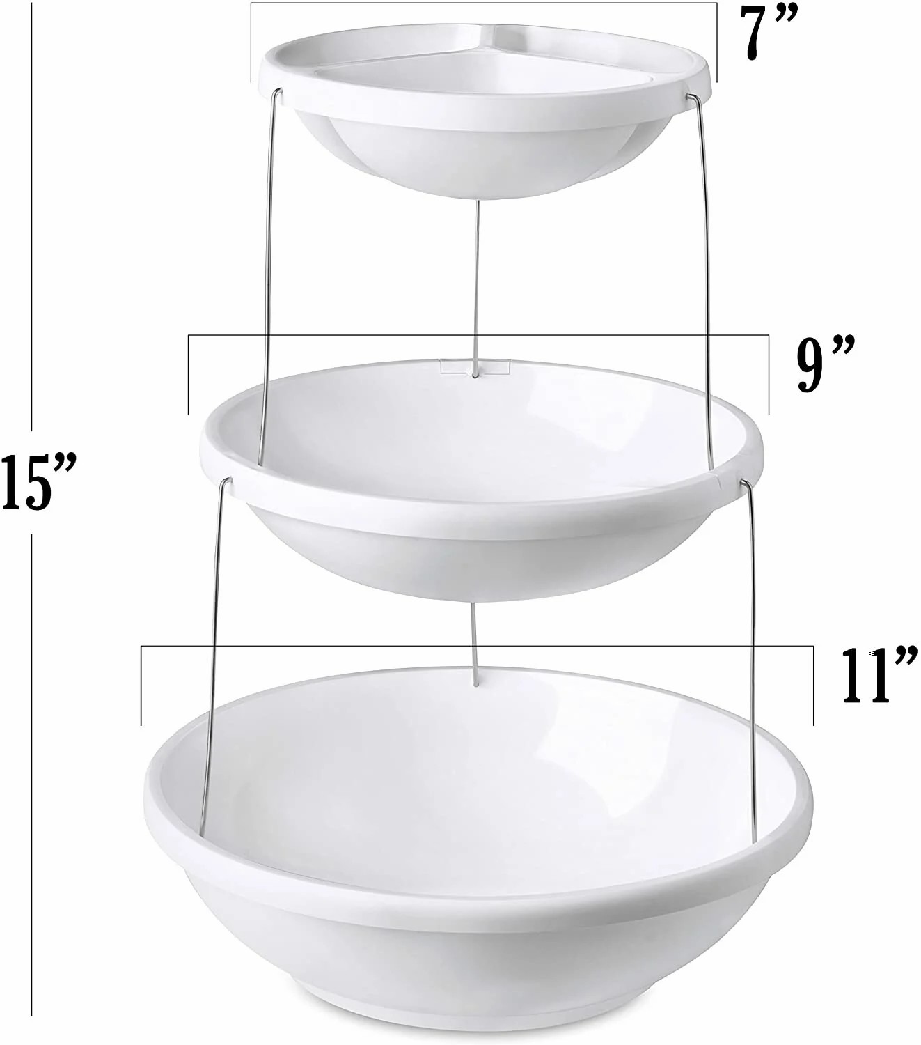 The patented plastic bowls twist down and nest in one another making it easy to store. These serving bowls are great for holding chips, pretzels, candies, salads, fruits or whatever you’d like to serve. Perfect to use at holiday dinners, family barbeques, office parties or any special event. Top bowl is divided into three sections, making it ideal for serving dips, nuts, chocolates or candies. These decorative bowls are manufactured from ABS material, making them sturdy and reliable.