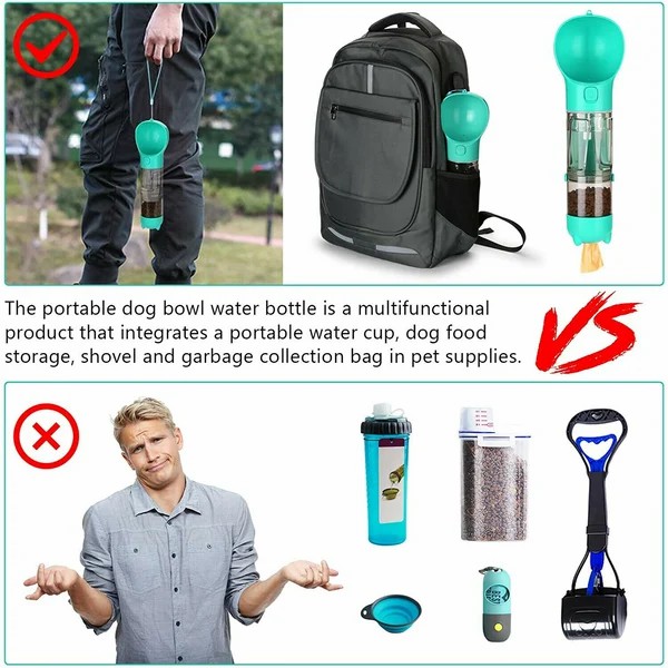Multifunctional Dog Water Bottle integrates water bottle, dog food bowl, dog waste bag and excrement scoop in one item. It provides a convenient, clean and solution to people who walk their dogs. It is great for outdoor walking, hiking and travel. Multifunctional pet water bottle; Integrate water bottle, dog food storage, dog waste bag and excrement scoop in one item; Made of food-grade ABS + PC material; Waterproof & 100% Leak-proof; Provide a safe, clean, convenient and solution to dog owners; Also comes with a lanyard for easy carrying; Deal for outdoor walking, hiking and travel. Size: 3.9 * 3.8 * 15.9inch; Water Bottle Capacity: It can store 300ml water capacity and 75g dog food. How to use: The bottle horizontal, slide lock key right to unlock, press water key to fill water. Release Water key to stop water; After feeding, slide lock key left to lock and prevent the water leakage. Package including: 1 * Dog Water Bottle; 1 * O-shaped Drinking Sink; 1 * Excrement Scoop; 1 * Dog Waste Bag; 1 * Dog food Bowl; 1 * Lanyard.